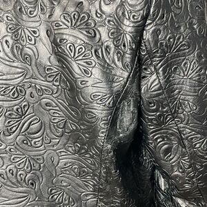 Genuine leather one button blazer in black with a laser cut floral pattern