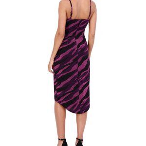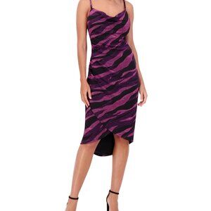 Turn up the glamour in this Siena Wavy-Print Tulip-Hem Bodycon Dress, a statement-making piece that combines bold color with a sleek silhouette. The striking purple and black wavy pattern shimmers with subtle metallic accents, while the draped cowl neckline and tulip hem create an effortlessly sexy yet elegant look. Perfect for cocktail parties, date nights, or any special event where you want to stand out.
