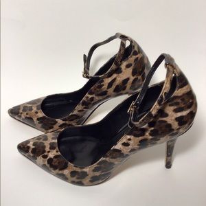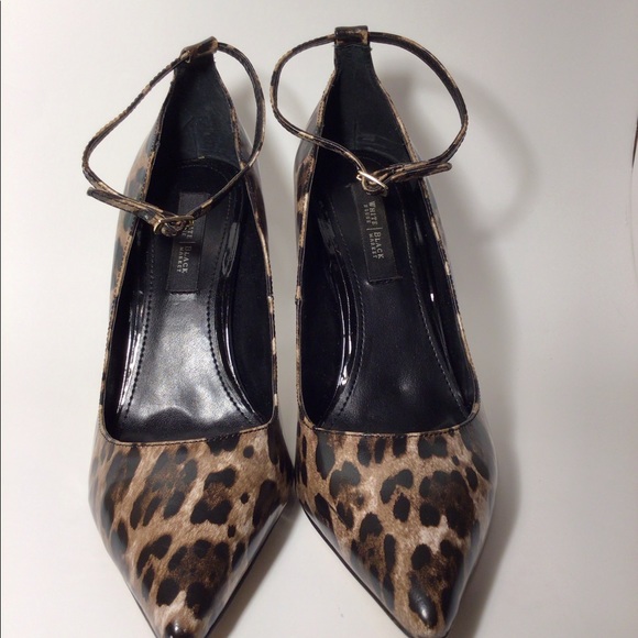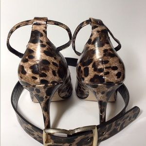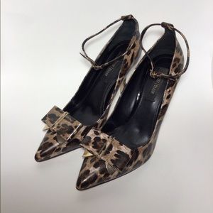 Matte patent leather finish look. This leopard heel can be worn with or without the bow. Sorry the box (damaged) couldn’t hold that tiger. Belt sold separately.