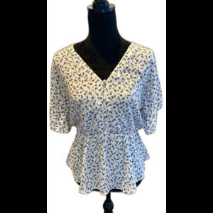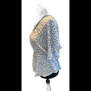 Sienna Sky Blouse Size Medium Elastic Waist Flutter Sleeves Cream Blue Flowers