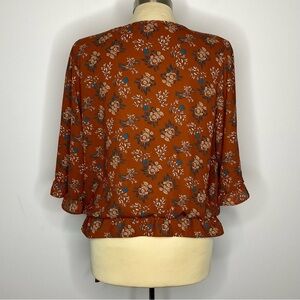 Sienna Sky Burnt Orange Blue Tan Floral Surplice Front Blouse. Lovely floral print with ruffle trim on sleeves and hem. Tie at waist with elastic waistband and fixed surplice neckline. New without tags, washed and unworn.