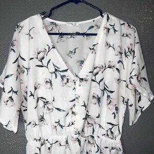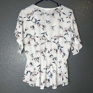 Sienna Sky Floral Peplum Blouse Large White Pink V-Neck Short Sleeve