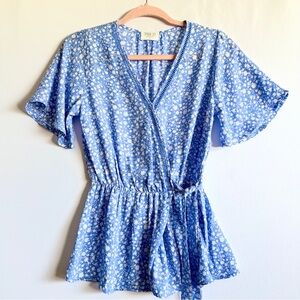 Gorgeous blue and white floral wrap-style blouse from Sienna Sky. Features a flattering V-neckline with delicate trim, elastic waist with tie detail, flutter short sleeves, and a feminine peplum hem. Lightweight polyester fabric with a flowy, romantic fit — perfect for cottagecore, spring, or everyday wear. Measurements (approx, laying flat): • Pit to pit: 18” • Length: 25” • Waist: 12”-19” (elastic stretch) Tagged size Small — best fits XS–S depending on desired fit. Style it with jeans, skirts, or layered over dresses for a versatile Y2K / coquette vibe. Tags: #cottagecore #coquette #y2k #romantic #floral Accepting all reasonable offers! Ships next business day.