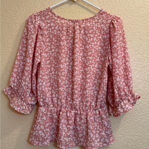Elegant pink blouse with floral pattern. Features a V-neck and ruffled sleeves. Perfect for casual outings.