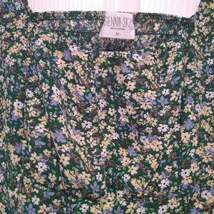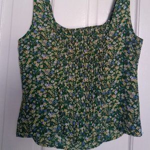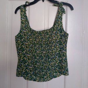 Green floral pattern with blue, brown, yellow, and white flowers, tie details on shoulder, ruched back, sleeveless size Medium. Very cute! Only worn 2x!