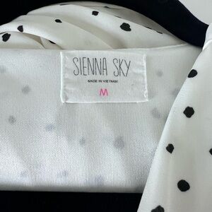 Chic high low dress with a wrap style. Features black dot pattern. Perfect for versatile wear.