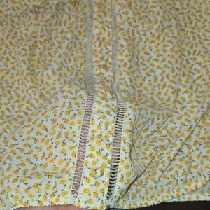 The Sienna Sky XS Blouse, is a great addition to any summer wardrobe. "Floral Ruffled Off-the-Shoulder Top" super lightweight for summer, bright feminine and cute as can be! Super flirty. It features an off-the-shoulder design with ruffle detailing on the sleeves and a yellow floral pattern on a white background. The blouse also has vertical lace-like inserts down the front. Sienna Sky is a brand known for its bohemian-inspired, soft yet durable women's wear. This is an extra small top and it is 100% Poly... hand wash hang dry....