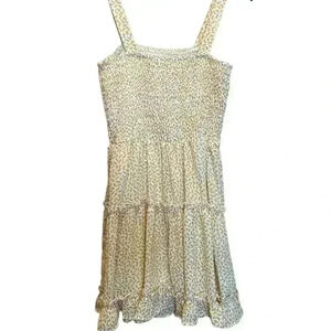 Sienna Sky Smock too dress. Shoulder straps. Ruffle bottom. Skirt fully lined. Tier ruffle. Top is stretchy to fit snuggly. Size: small. Color: printed small yellow gold flowers on ivory background. 100% polyester, Lining: 95% polyester and 5% spandex. Measurements laying flat: 14.5”. Shoulder to waist 16”. Waist to hem 17.25”. No rips, tears or stains. Pet free smoke free environment. FINAL MARKDOWN