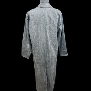 Sierra West full length denim jacket in a washed black it doesn’t have a size on it but I would call it an extra large armpit to armpit is 24 inches so 48 inches around might even be a 1X it’s very roomy