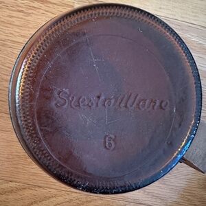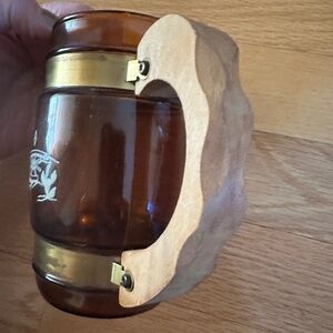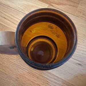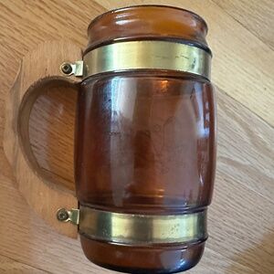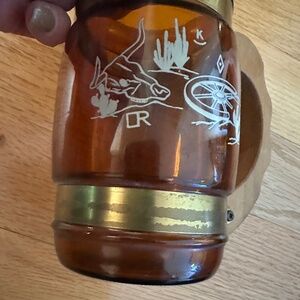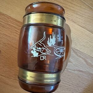 Siesta Ware Amber Color Set of Two Barrel Mugs. Vintage. Two barrel mugs, amber color glass with brass tone metal bands around the top and bottom of the mug. Wood handles. One mug has a design of a cowboy boot and stirrup with a branding iron and brands. Siesta Ware and the number 4 in raised print on the bottom. The other mug has a design of a steer skull, wagon wheel and cacti. Siesta Ware and the number 6 in raised print on the bottom of it. Some discoloration on the metal bands. Excellent, vintage condition with no chips or cracks. White paint of the designs is bold with no sign of fading.