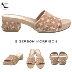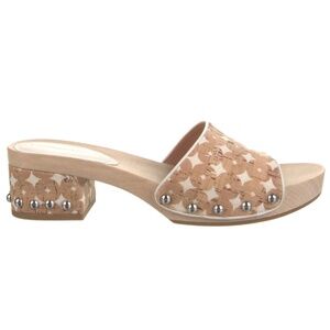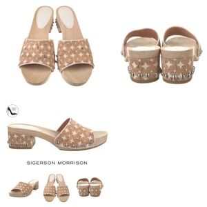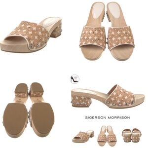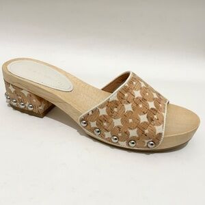 Sigerson Morrison Akira Women’s Beige Canvas Corc Tan Printed Slides stud clog sandals Wooden Platform Block Heel Mules
