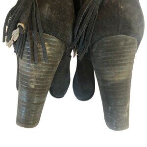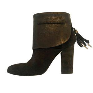 Sigerson Morrison "Ferg" black textured leather and suede fold over style booties. Botties are 3:5” high and have fringe detailing on the back with metal feather details. They're very cool boots! Booties are a woman's size 9. Org. list price $398.