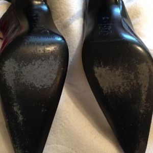 Barely worn, black leather sling back heels with pointy toes. Intricate detailing along the edges & strap detail. Includes original dustbag.