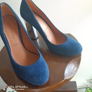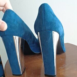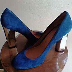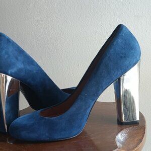 Sigerson Morrison New York Blue Suede Heels/Pumps With Gold Metallic Heel,