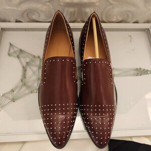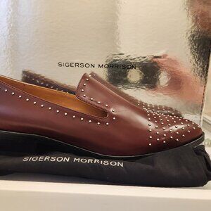 Sigerson Morrison Italian Leather "Edna" Studded Loafers. NIB. Size 8.5. Brand new in original box/packaging with dust bag. Gorgeous. No rips/stains/scuffs/tears/peeling/wear or flaws. Rounded Point toe. Silver studs (all intact). I would call the color Burgandy/Brown. Heel height 1 inch. Smoke free home. No odors. All offers are welcome. Thank you!