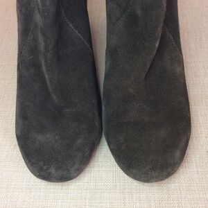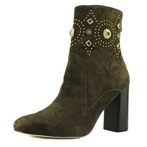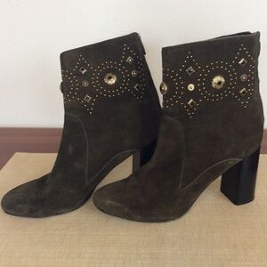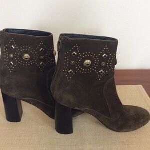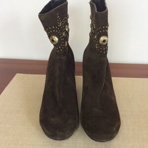 Beautiful dark brown suede ankle boots with a gold tone stud pattern embellishment on the shaft of the boots. Boots have a back zipper closure. Heel is 3.25" high and a leather sole. Shaft height is 7 1/4 " and shaft width is 9". Boots are in excellent pre-owned condition. No studding detail missing.