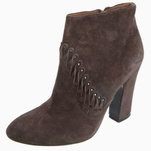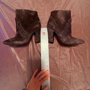 • Sigerson Morrison Suede Leather Fringe Embellished Ankle Boots 4” Heel Size 7.5