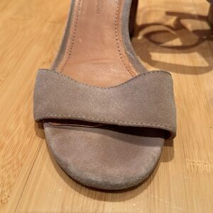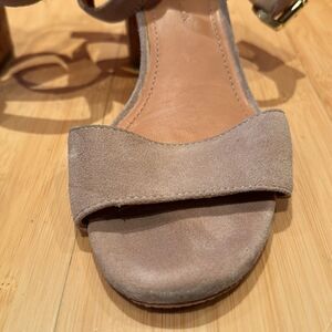 Love these sandals. Cork heals. Perfect color. Has a little wear on the suede but still has alot of life left in them. Double strap at the ankle. A must have sandal for the summer
