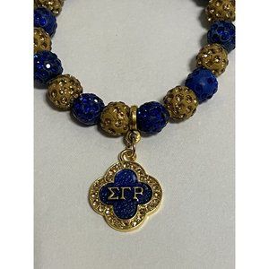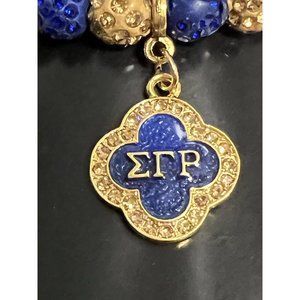 This stunning bracelet has a beautiful Fleur charm that is embellished with sparkling golden rhinestones and features the Sigma Gamma Rho Letters embossed on a blue enamel background.
