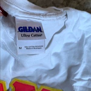 White Gildan unfitted medium Tshirt. Double layers bottom yellow w/ pink top.