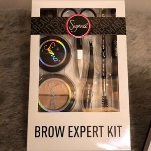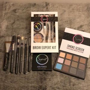 Eyeshadow palette, brow expert kit in dark, powder in pet name and 6 brushes. Over $230 in products if sold separately.