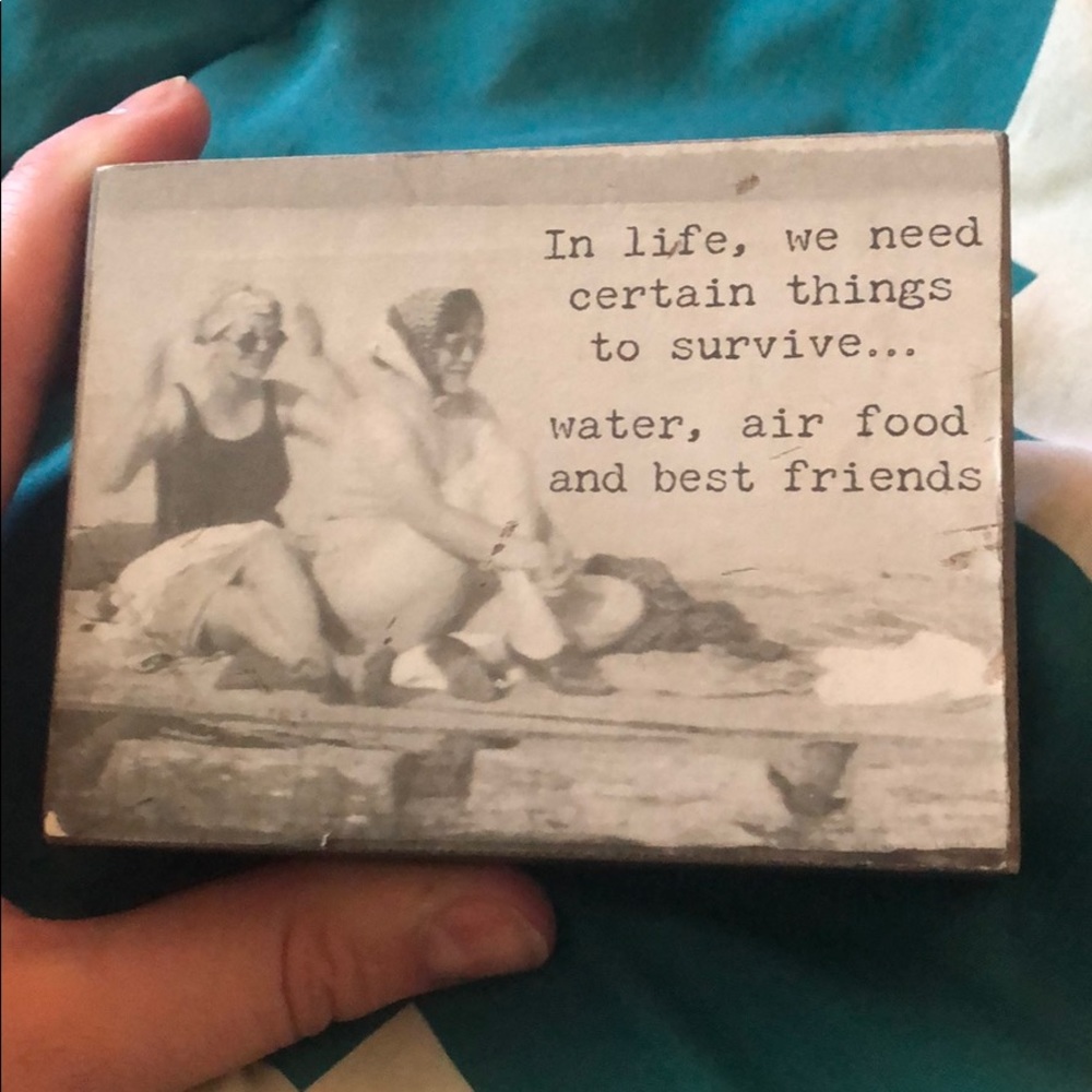 Small rectangular sign that says “in life, we need certain things to survive... water, air food and best friends”