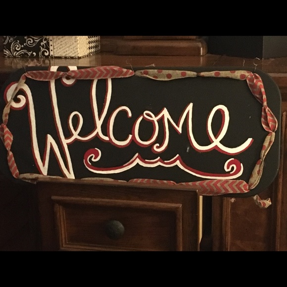 Old metal painted black with hand painted lettering and ribbons