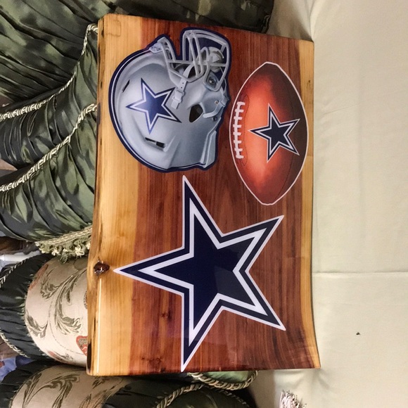 Sign made out of oak wood with the Dallas Cowboys on it