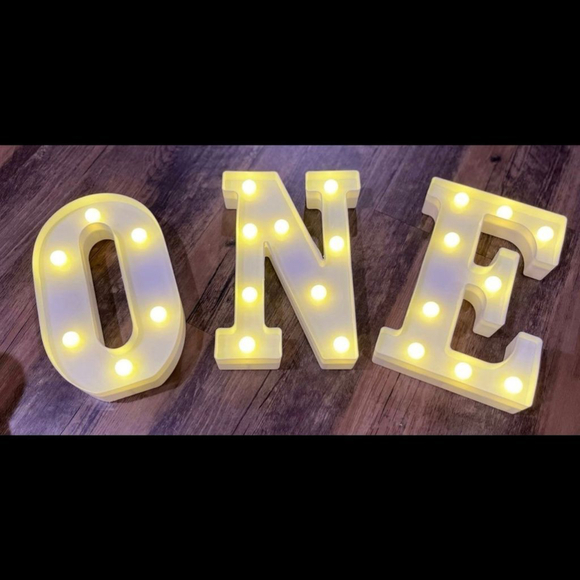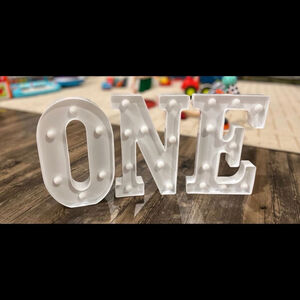 Light up ‘O N E’ 3 piece sign. One year old birthday or photo prop. Uses batteries to operate.