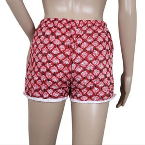Lightweight, colorful all-cotton shorts have lace trim at the edges and comfy elastic drawstring waists. Roomy legs, small side vents.
