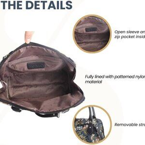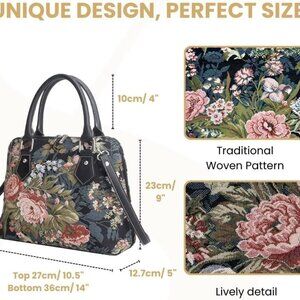 Product details Fabric type Woven Tapestry Origin Imported Closure type Zipper Lining Polyester About this item Fully lined with a patterned polyester Open sleeve and zip pocket on the inside Fitted with a full length zip fastener Faux leather handle and detachable shoulder straps included, handle drop approx 4" and max shoulder strap length approx. 45" Product dimensions approx. W 14" X H 9" X D 5" Weight: 1 lb Please note: Design may vary due to our production methods See more About this item