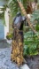 What a beautiful dress. A tie back closing. Those cups are slightly padded, and the sides of the dress are boned so it stays put nicely. A full skirt and a solid layer and a sheer layer of silk. Beautiful gold florals on a black background in excellent conditionready for dancing