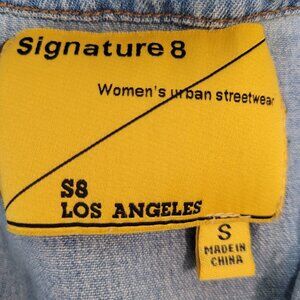 The Signature 8 Blue Chambray Distressed Urban Streetwear Shirt in size Small is a versatile and stylish addition to any woman's wardrobe. Made from 100% cotton chambray fabric, this classic long-sleeve button-up shirt features a collared neckline and a solid blue color with a distressed urban streetwear design. Suitable for travel, casual outings, and workwear, this lightweight and breathable shirt is machine washable and equipped with pockets for added convenience.
