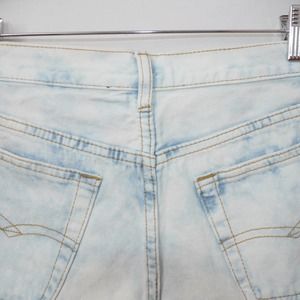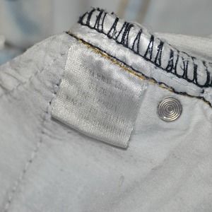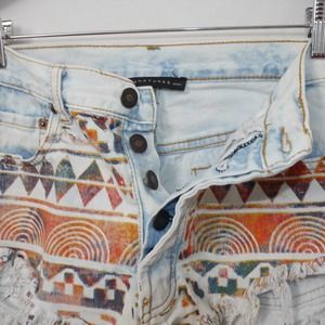 100% Cotton, Light Wash with Geometric Multi Color Print, Button Closure, 5 Pocket Design, Distressed Look/ Fringe Hem, Belt Loops