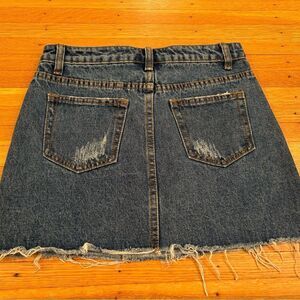 Signature 8 denim ripped mini skirt. Raw hem. 2 pockets in front and back. Belt loops. 100% cotton. Waist across front 14 inches. Length 13 inches. Size small. Excellent/like new condition!