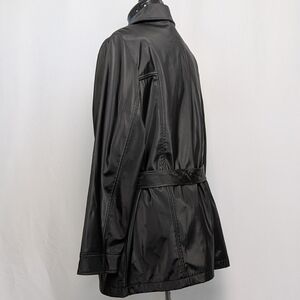 Chic black jacket with a sleek belt. Features a zip-up front, front pockets, and modern collar. Shoulder pads sewn in.