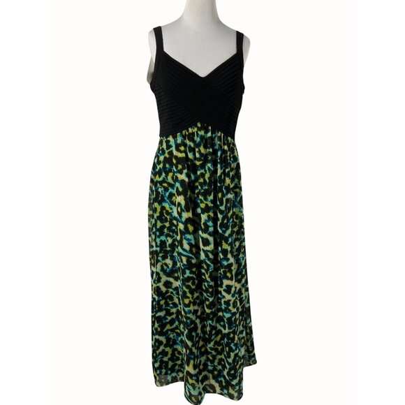 Signature By Robbie Bee Maxi Dress Black Ruched Multicolor Animal Print NEW 12