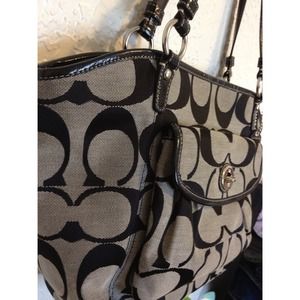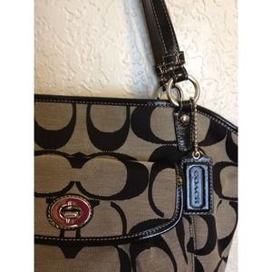 Here is my awesome Coach shoulder bag that needs a new home. Signature fabric with leather trim, zip-top closure, fabric lining, 2 inside compartments, outside turnlock pocket. Barely used. Bottom length 10" x Top length 16" x 11" H.