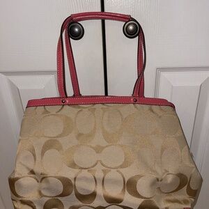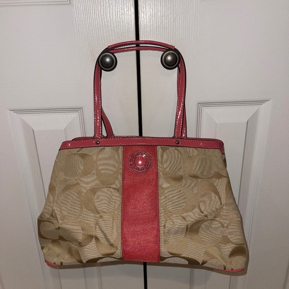 Signature Coach fabric purse with pink patent leather accents