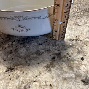 Elegant and timeless Signature Collection “Petite Bouquet” gravy boat made in Japan. Features a delicate pink rose floral motif, silver platinum trim, and a graceful handle and spout. This fine china piece pairs perfectly with the matching dinnerware set and adds a refined touch to any formal dining table.