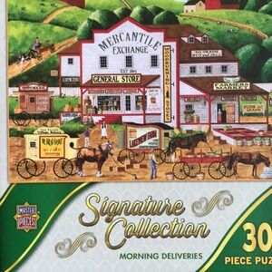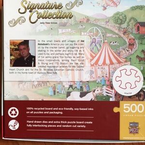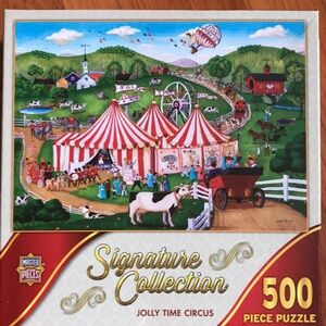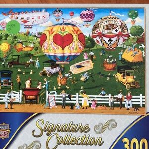 Set of three Signature Collection puzzles. Includes Morning Delivery, Flights of Fancy, and Jolly Time Circus. Vibrant and colorful designs.