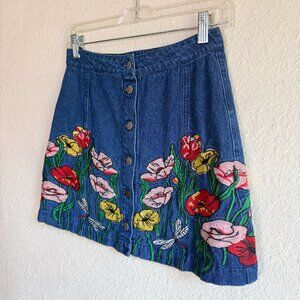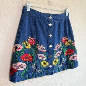New Signature Eight denim skirt with bright colorful embroidered flowers and silver buttons up the front, size small. Perfect condition and ready to rock!