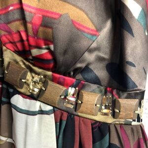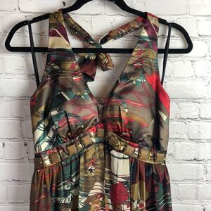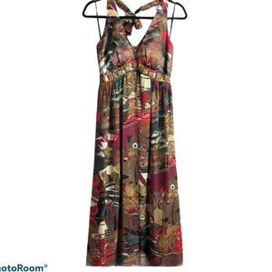 Signature by Robbie Bee. Beautiful chiffon halter dress with gold and Wood beaded details under the breast line/empire waist. long skirt covered with a sheer overlay that splits down the middle. So pretty.