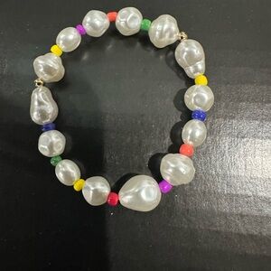 Set of colorful beaded and silver bangles. Features pink, silver, and multicolored beads. Perfect for adding a pop of color to any outfit.