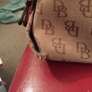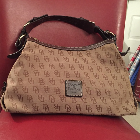 Signature Dooney Hobo with normal wear & tear. On the inside of this handbag there is 1 zipper pocket and 1 smaller pocket.