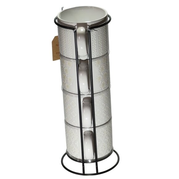Crafted by Signature Housewares, this set of four stoneware stacking mugs comes with a metal rack. The elegant design and light gray pattern make it a stylish addition to any kitchen or dining area. These mugs are dishwasher safe, ensuring convenient maintenance and long-lasting quality.