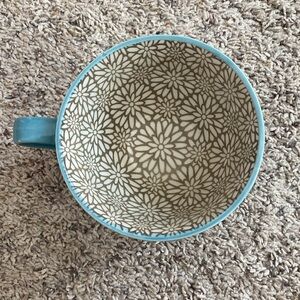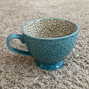 Gorgeous coffee and tea mug. Turquoise/blue with raised pattern on outside. Floral pattern on the inside. In excellent condition. No signs of wear, cracks or chips.