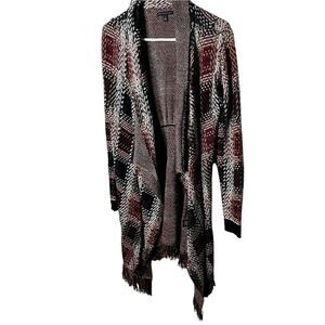 EUC smoke free dog friendly home Signature I open front plaid cardigan sweater size small fringe fall autumn winter Measurements are approximately 20” bust and 33” length. Bin 42