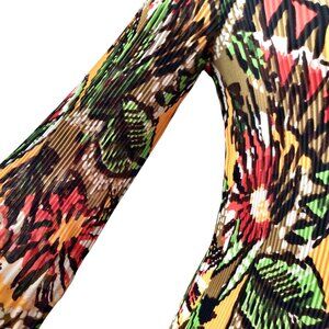 Good condition, minor signs of wear, no rips, holes or tears, pretty brightly colored botanical/floral print, accordion pleated, has attached necklace