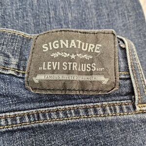 Features Signature Levi Strauss Slim Straight dark wash denim jeans, painted, slim fit, straight leg, 5 pocket design, mid rise, single button with zipper closure, classic casual style.